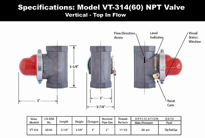 The valve consists of a swing check valve arrangement with an acceleration-sensitive triggering mechanism. The trip mechanism consists of a steel ball resting on a tapered cup-shaped support. The horizontal motion of an earthquake causes the ball to move from the center of the support. This allows the balls mass to act upon the movable pipe of the trip mechanism, activating the valve and initiating closure. Springs assist the valve- flapper to close and gas pressure assists in holding the valve disc in the closed position. The trip mechanism is factory set and sealed. A sight glass is provided so that the Open or Closed indicator can be seen, and the trip mechanism status of the valve can be easily determined.