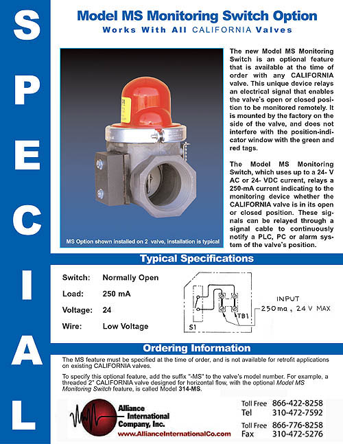 The Model MS Monitoring Switch, which uses up to a 24- VAC or 24- VDC current, relays a 250-MA current indicating to the monitoring device whether the CALIFORNIA valve is in its open or closed position. These signals can be relayed through a signal cable to continuously notify a PLC, PC or alarm system of the valve’s position. | ||||