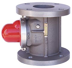 The valve consists of a swing check valve arrangement with an acceleration-sensitive triggering mechanism. The trip mechanism consists of a steel ball resting on a tapered cup-shaped support. The horizontal motion of an earthquake causes the ball to move from the center of the support. This allows the balls mass to act upon the movable pipe of the trip mechanism, activating the valve and initiating closure. Springs assist the valve- flapper to close and gas pressure assists in holding the valve disc in the closed position. The trip mechanism is factory set and sealed. A sight glass is provided so that the Open or Closed indicator can be seen, and the trip mechanism status of the valve can be easily determined.