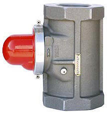 The valve consists of a swing check valve arrangement with an acceleration-sensitive triggering mechanism. The trip mechanism consists of a steel ball resting on a tapered cup-shaped support. The horizontal motion of an earthquake causes the ball to move from the center of the support. This allows the balls mass to act upon the movable pipe of the trip mechanism, activating the valve and initiating closure. Springs assist the valve- flapper to close and gas pressure assists in holding the valve disc in the closed position. The trip mechanism is factory set and sealed. A sight glass is provided so that the Open or Closed indicator can be seen, and the trip mechanism status of the valve can be easily determined.
